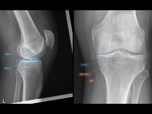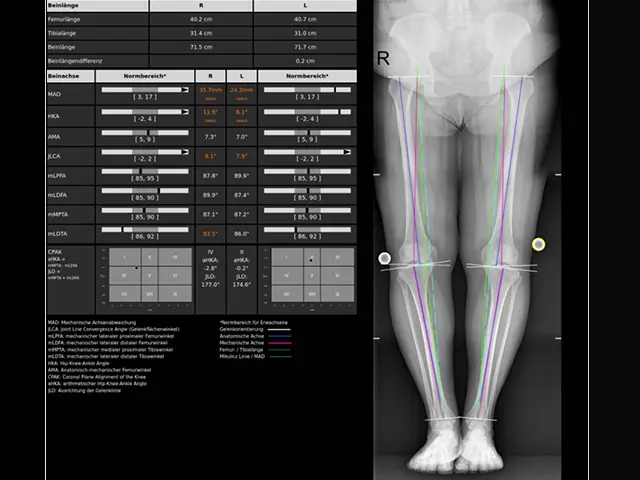 3. AI-supported axis measurement: For precise planning, we use LAMA® AI software, which calculates all relevant parameters of your joint geometry precisely from a full-leg X-ray. This allows us to identify any misalignment in detail.